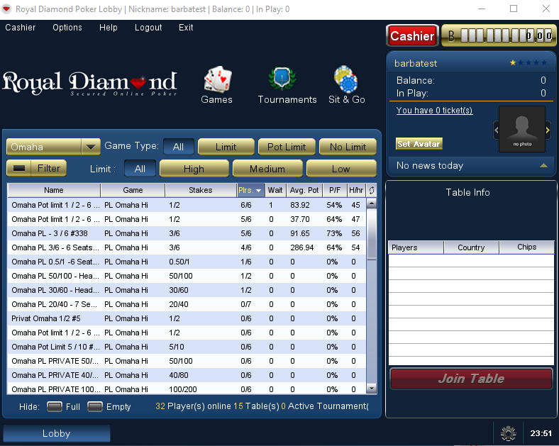 Royal Diamond Poker is one of several Israeli networks in our arsenal. This room is primary focus is Pot Limit Omaha (PLO) and as the other rooms from this region (Clubpoker, Poker717, Poker247, GoldPoker PRO, Poker Sharks and Pureplay Poker) you will have to deal with a handful of local aggressive players.