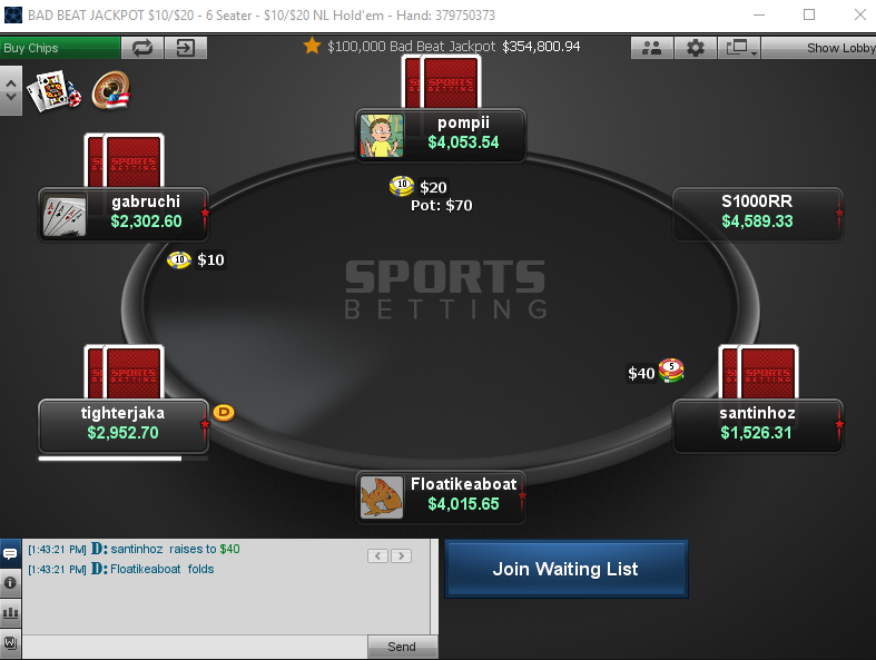 SportsBetting Poker es una de las máscaras de Chico Poker Network, al igual que Tiger Gaming y BetOnline. Una de las mejores cosas de esta red es la gran cantidad de peces de Estados Unidos y Canadá. Un casino y apuestas deportivas también están disponibles, incluyendo carreras de caballos, deportes y divisas